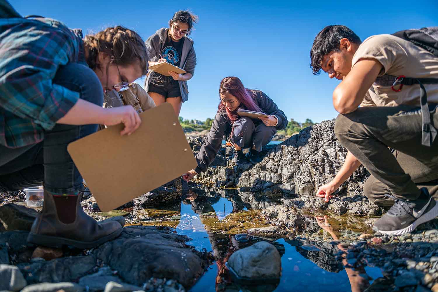 Biology students recording their observations about plants and animal life on the shore in Nahant, MA
