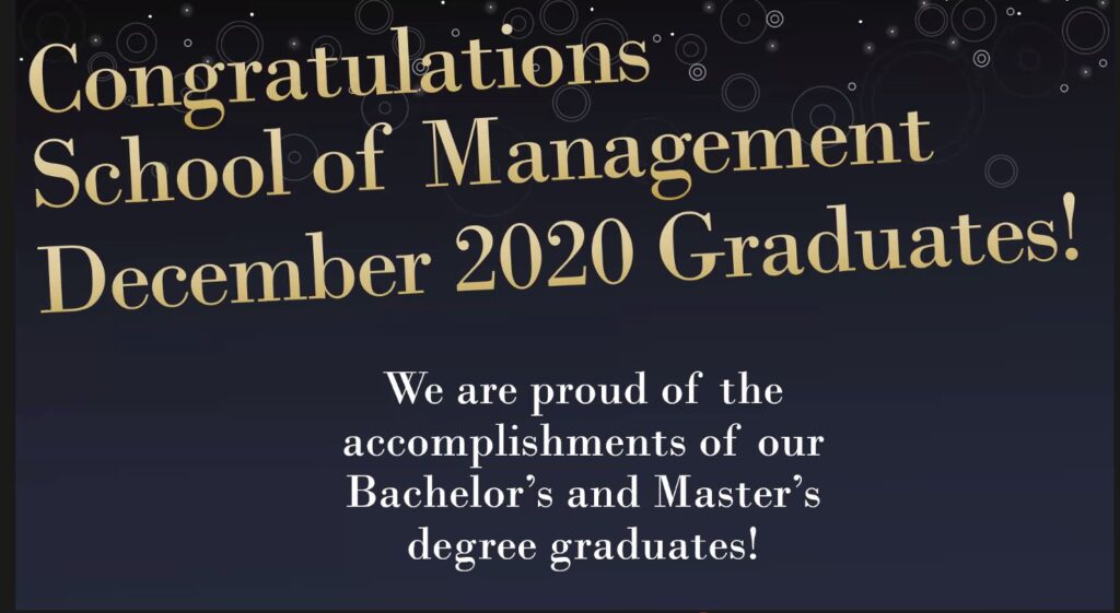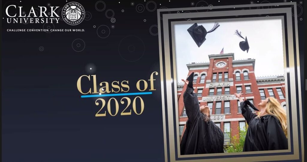 The Clark University School of Business Class of December 2020 was honored with a virtual graduation recognition ceremony on Tuesday, December 15, 2020. Despite the nontraditional circumstances preventing an in-person event, School of Business’s virtual celebration included an address from Dean Alan Eisner and speeches by Professor Laura Graves and MBA student Qingqing Lu, president of School of Business Student Council.