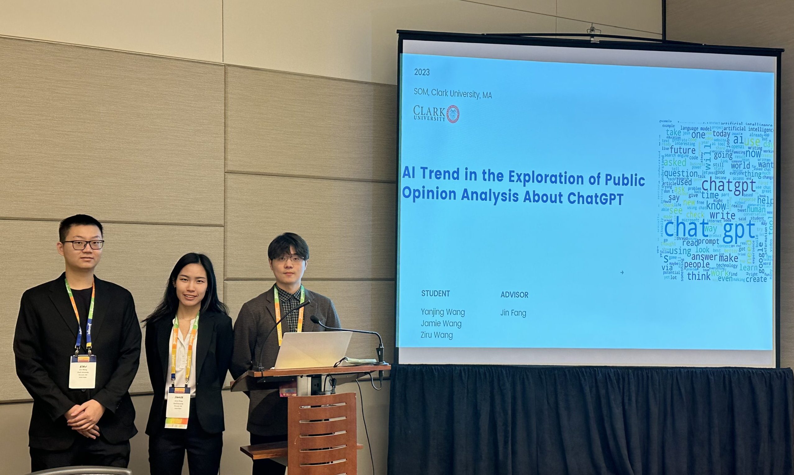 INFORMS is one of the world’s largest conferences on data science and related fields. It brings students and industry experts from around the globe together to share knowledge and research, with a focus on allowing students to be part of the presentation experience. Jamie, Ziru, and Yanjing presented their research titled, “AI Trend in the Exploration of Public Opinion Analysis About ChatGPT.” The students used Python to analyze millions of tweets about Chat GPT, organized the data into topics using a method called Latent Dirichlet Allocation, and then figured out people’s feelings toward Chat GPT using a sentiment analysis tool. To the students’ delight, the topic brought a packed room.