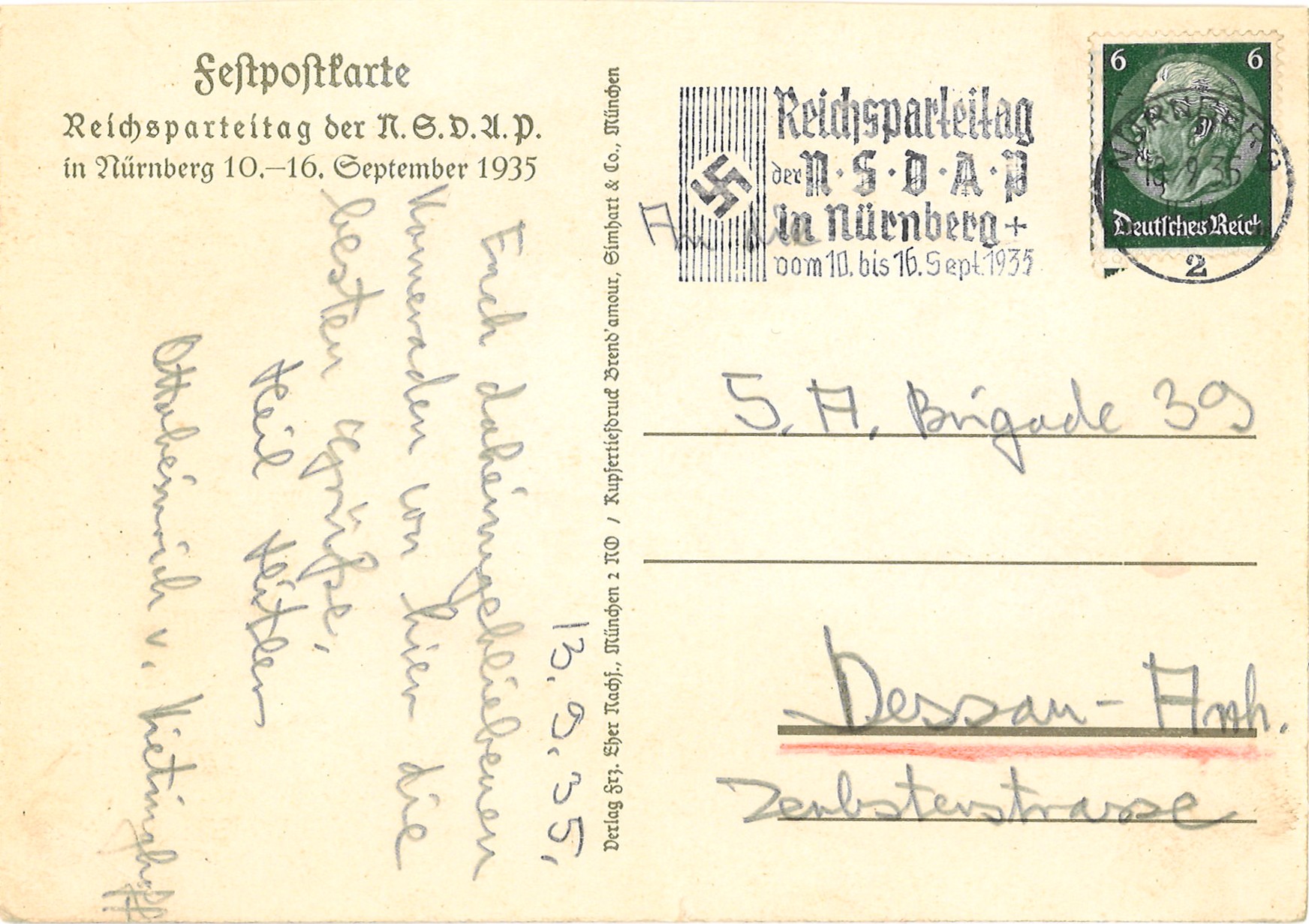 Based on the date on the postmark and the message on the back, Vietinghoff bought the postcard at the 1935 Reichsparteitag (Nuremberg Rally) and sent it to those from his brigade who could not make it.