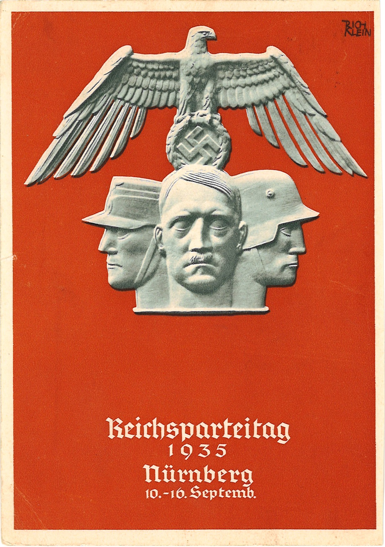 A depiction of a stone carving of Hitler staring straight ahead flanked by two soldiers gazing into the distance with the Nazi eagle above the three figures. Text reads “Reichsparteitag 1935 Nürnberg 10.–16. September.”