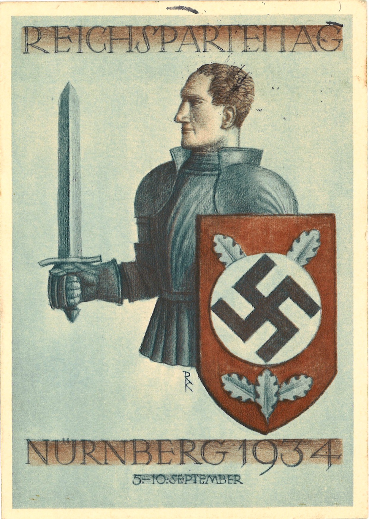 Medieval imagery was used in Nazi propaganda to portray their actions as the restoration of venerated German history and folklore. In the case of this postcard, generic medieval imagery was likely used for the 1934 Nuremberg Rally (Reichsparteitag) due to the absence of an official theme leading up to the event. After the fact, it was labeled as the Rally of Unity and Strength, Rally of Power, or Rally of Will.