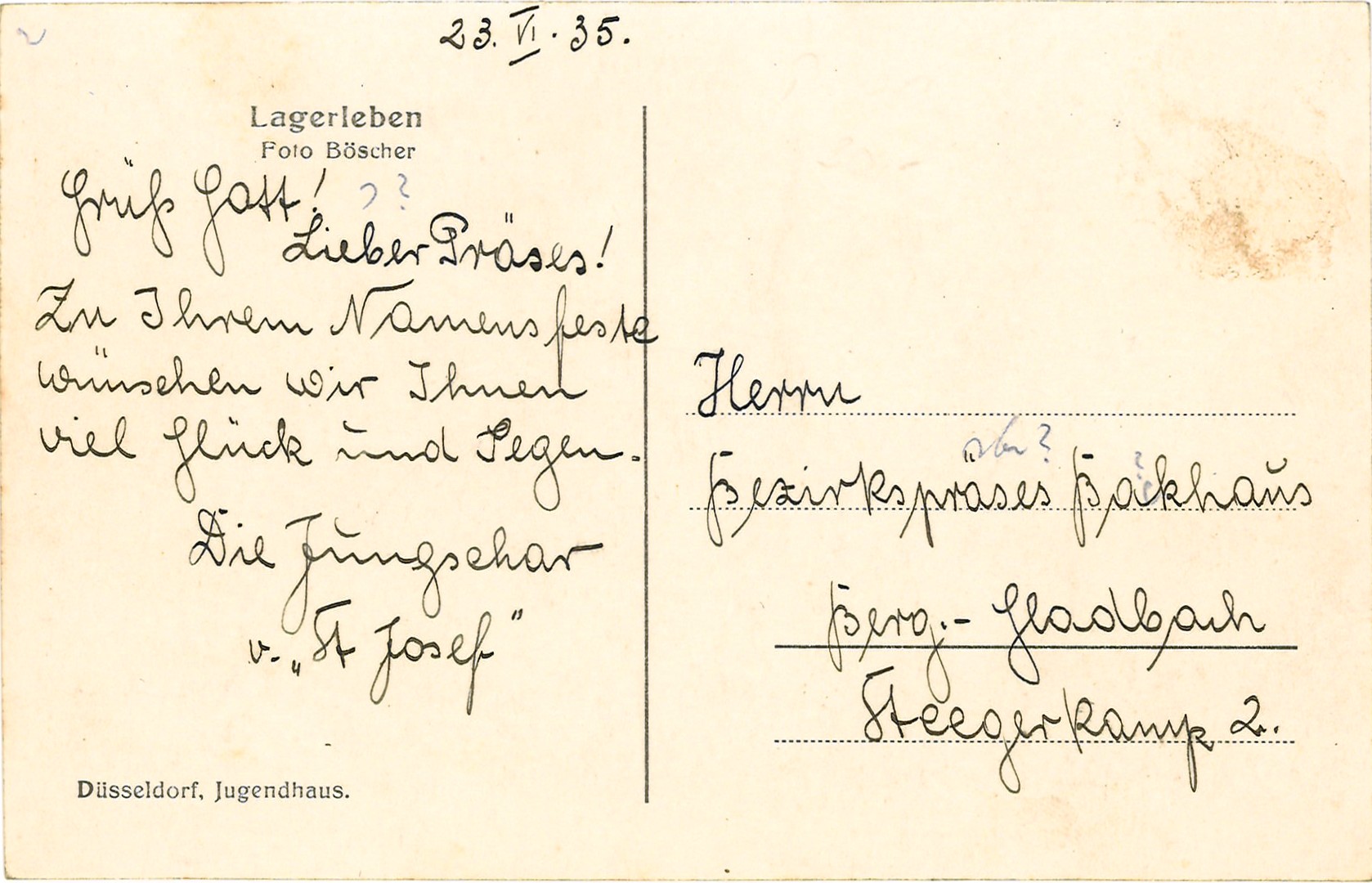 A photograph representing “camp life” at the Jugendhaus Düsseldorf, a summer camp hosted by St. Joseph’s Catholic Church in Düsseldorf. Children are engaging in a musical performance dressed in camp uniforms.