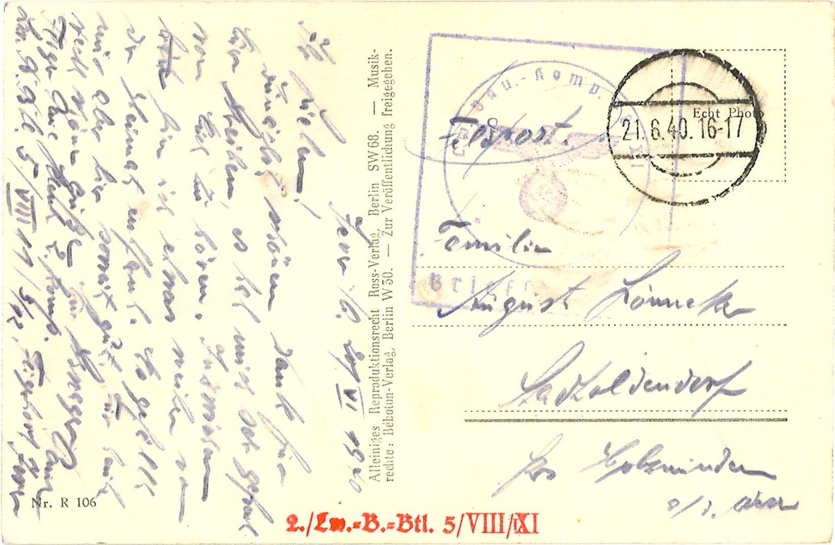 Stamp: The hand-stamp usage in 1940 over an adhesive postmark indicates that this postcard was mailed by the feldpost.