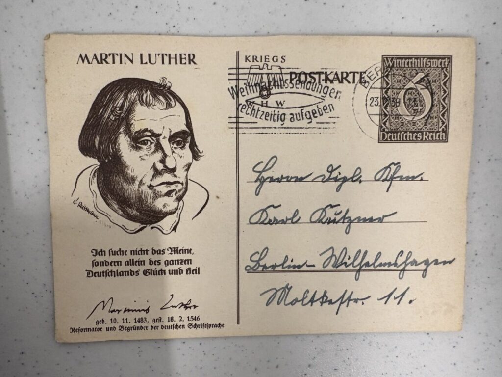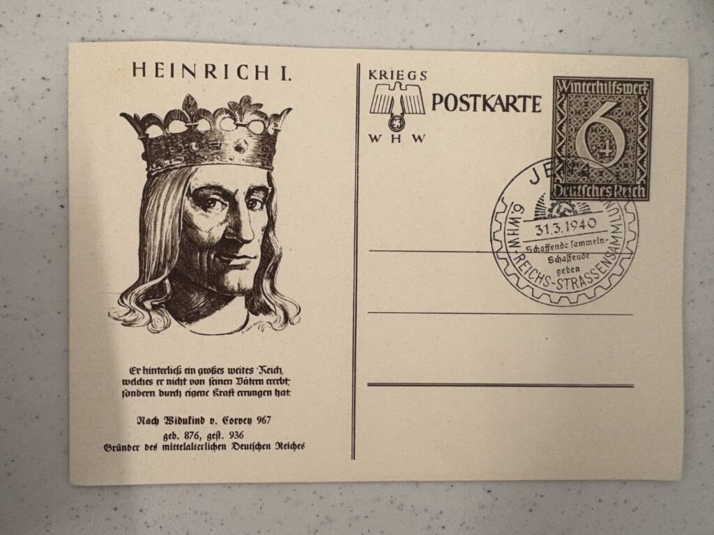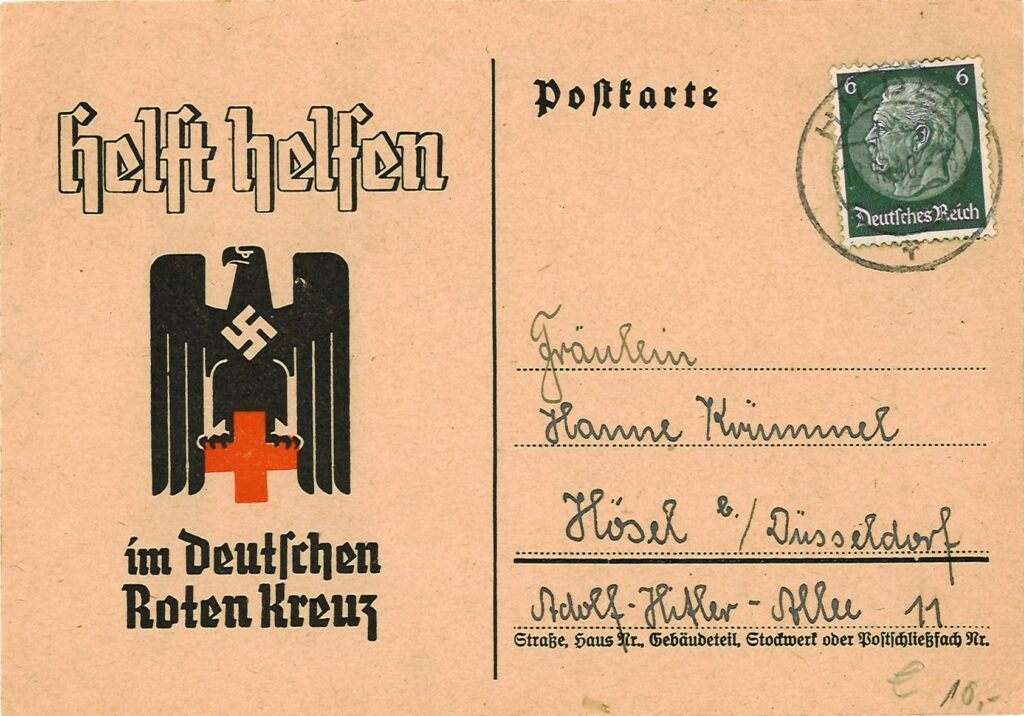 Postcards were printed and sold throughout Germany and German-occupied territories. The postcards offered an affordable way to stay in contact with family and friends in an era before wide access to mass communication, and this common form of communication became interwoven with images of Hitler and party symbols. The postcards show the massive popularity that Hitler enjoyed in Germany during this era. Nazi propaganda often used Hitler’s image, building a myth of his supposed invincibility and charisma. The leader became associated with the nation’s prosperity and was portrayed as central to its future success. Hitler’s images cast him as a hero, a father figure, and a protector of Germany—and they appeared almost everywhere in Germany during the years of Nazi rule. By late 1943 the printing of postcards stopped due to extreme material shortages from the war. (Source: USHMM)