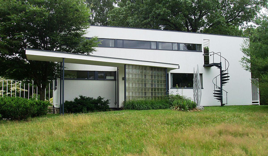 Gropius House in Lincoln features New England architecture — wood, brick, and fieldstone — with innovative materials of glass block, acoustical plaster, chrome banisters, and the latest technology.