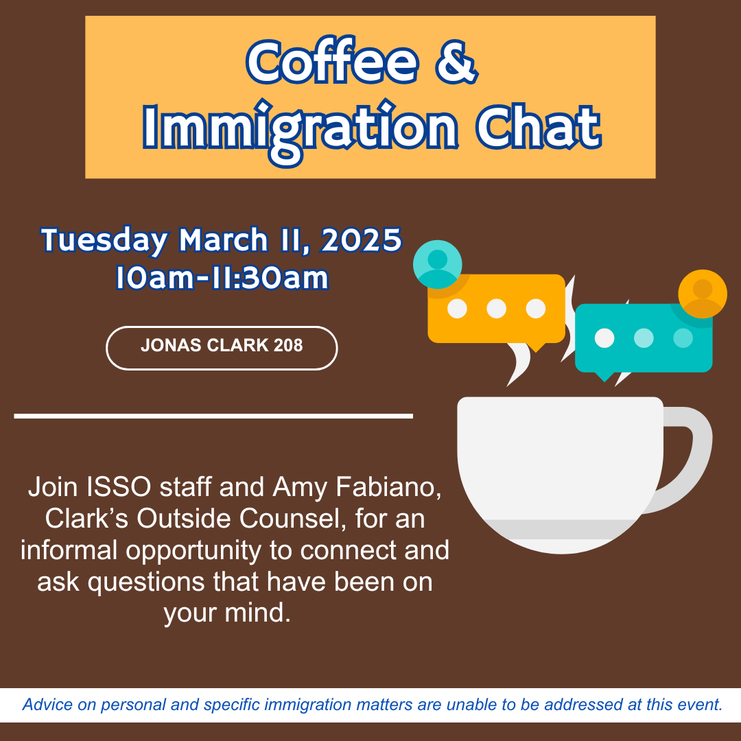 Join ISSO(International Students & Scholars Office) and Amy Fabiano, Clark’s outside Counsel, for an informal opportunity to connect and ask questions that have been on your mind.