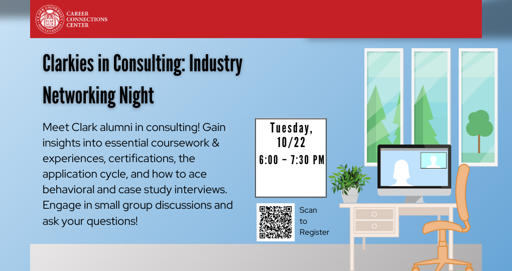 Meet Clark alumni in consulting! Gain insights into essential coursework & experiences, certifications, the application cycle, and how to ace behavioral and case study interviews. Engage in small group discussions and ask your questions!