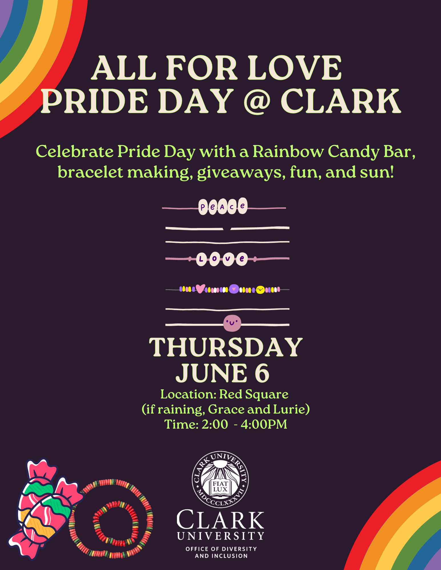 We are excited to welcome June as Pride Month and to host our Pride Day event. We will have a Rainbow Candy Bar, bracelet making, and giveaways!