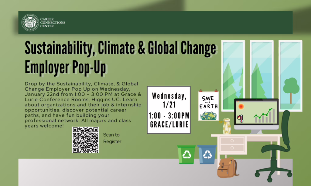 Looking for internships or career opportunities in sustainability, climate, and global change? Drop by the Employer Pop-Up to meet organizations, explore job and internship openings, and discover potential career paths. Expand your professional network while learning about how you can make an impact—all majors and class years are welcome!
