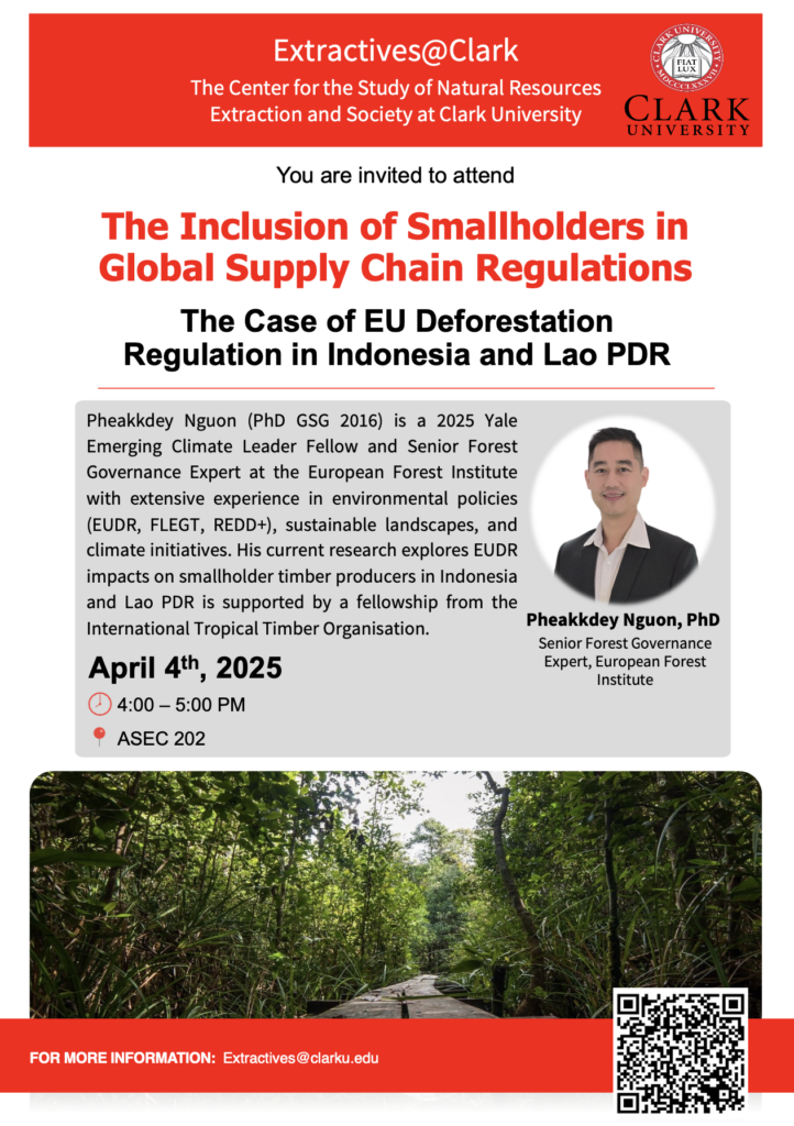Our speaker, Pheakkdey Nguon, Ph.D. ’16, is a 2025 Yale Emerging Climate Leader Fellow and Senior Forest Governance Expert at the European Forest Institute with extensive experience in environmental policies (EUDR, FLEGT, REDD+), sustainable landscapes, and climate initiatives. His current research exploring EUDR impacts on smallholder timber producers in Indonesia and Lao PDR is supported by a fellowship from the International Tropical Timber Organization.