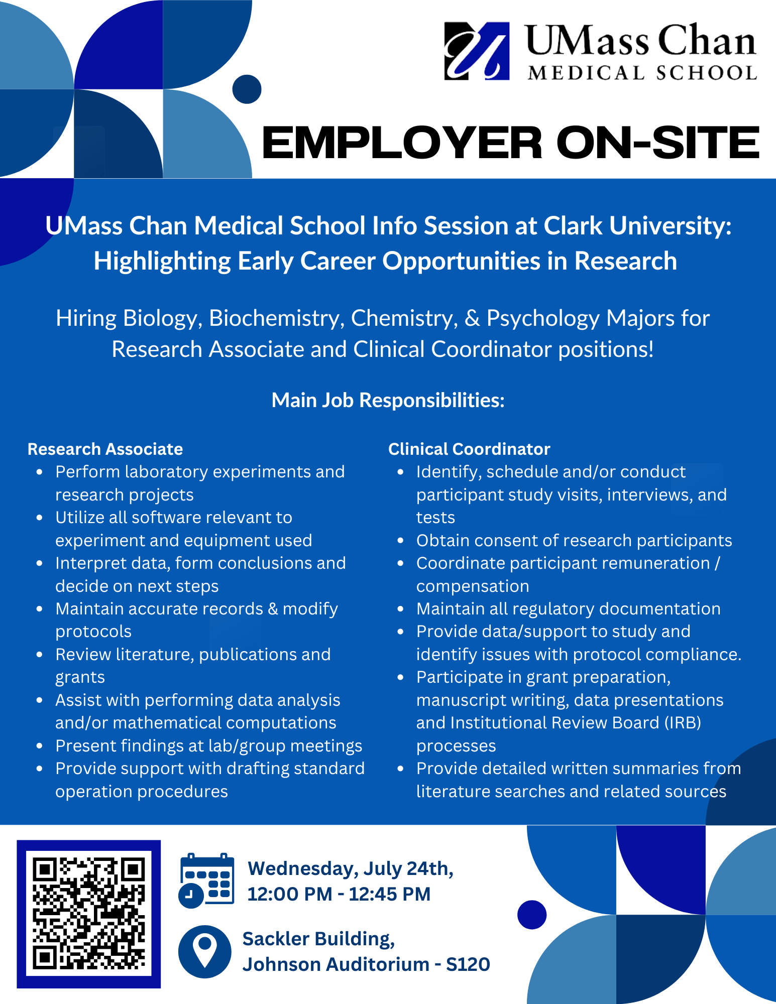 Attention Biology, Chemistry, & Psychology majors! UMass Chan Medical School is recruiting new grads and early career professionals for Research Associate and Clinical Coordinator positions. Whether you’re a new grad seeking full-time employment or curious about possibilities for your future, all are welcome!
