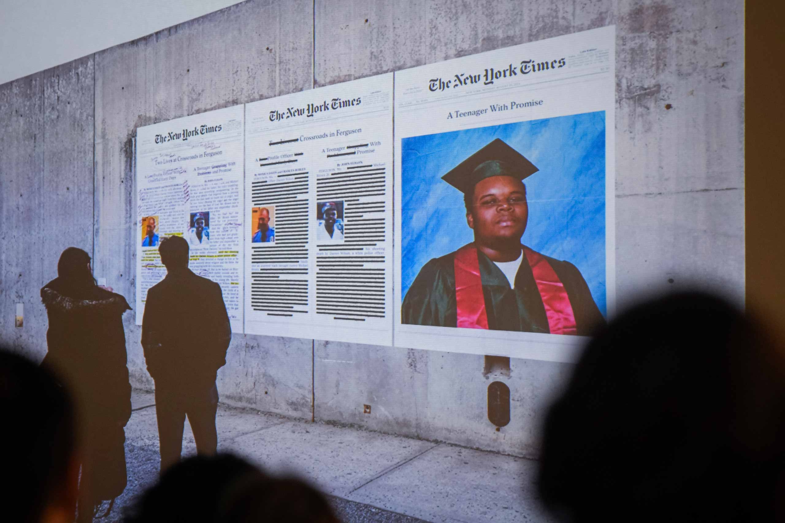 Slide presentation by interdisciplinary artist, Alexandra Bell, showing the public art series, Counternarratives, MoMA PS1 courtyard. The event was part of the Center for Gender, Race, and Area Studies seminar series, Democracy, Repression, and Resistance.