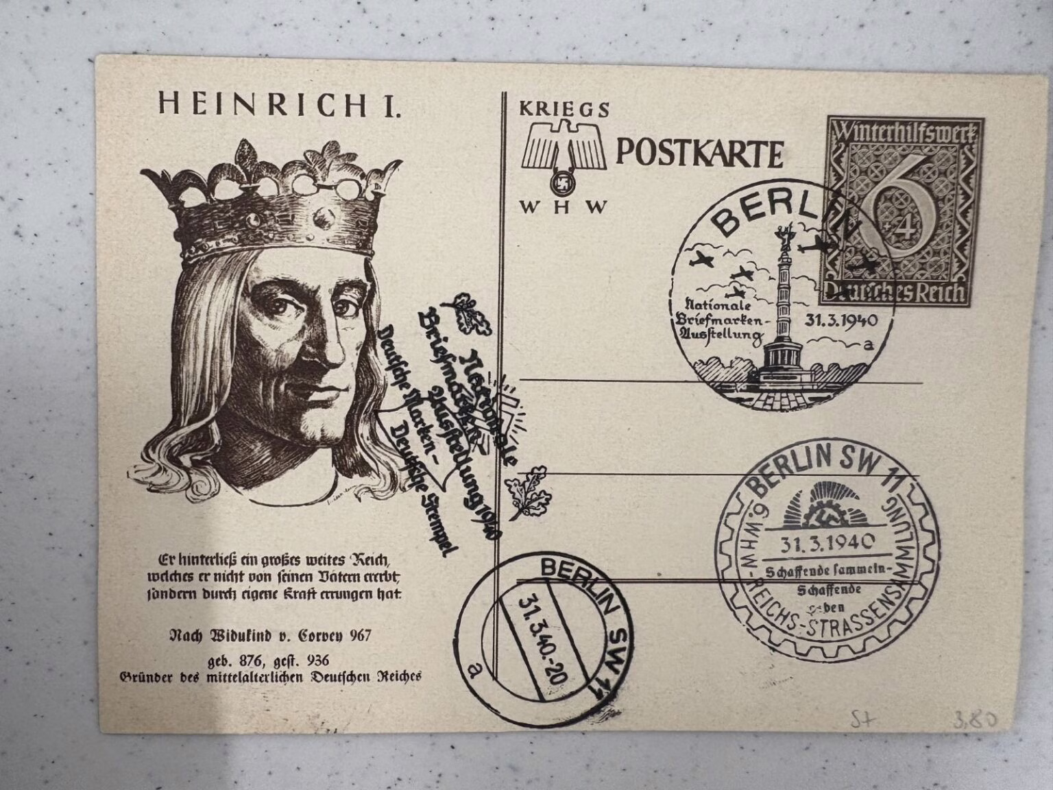Postmark: BERLIN, “Nationale Briefmarken-Ausstellung” (National Stamp Exhibition), with an illustration of the Berlin Victory Column with airplanes flying overhead. BERLIN SW 11 (a postal district in Berlin), 31.3.1940, “REICHS-STRASSESAMMLUNG” “Schaffende sammeln”. BERLIN SW 11, 31.3.40.-20 (signifies March 31, 1940 at 20:00).