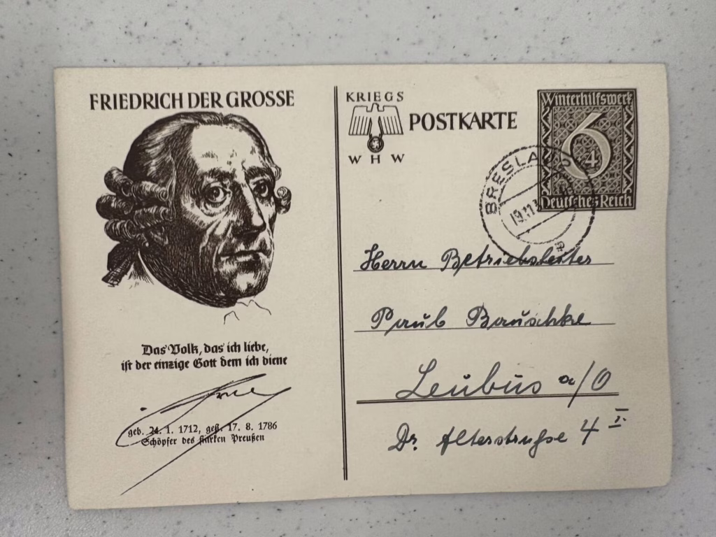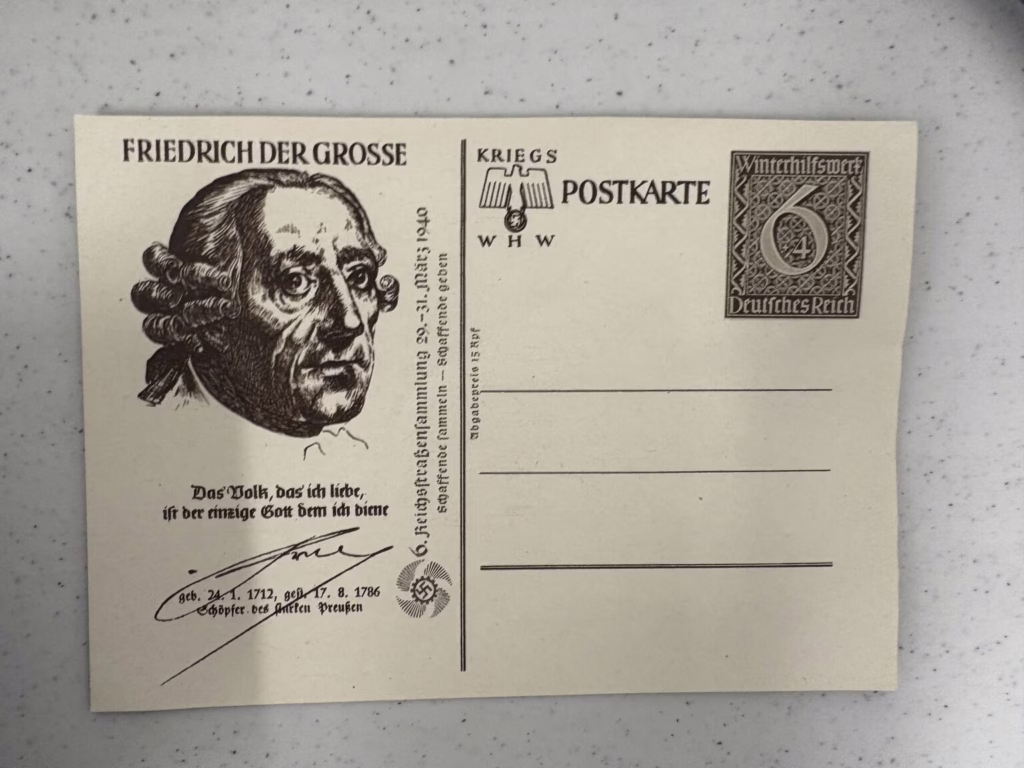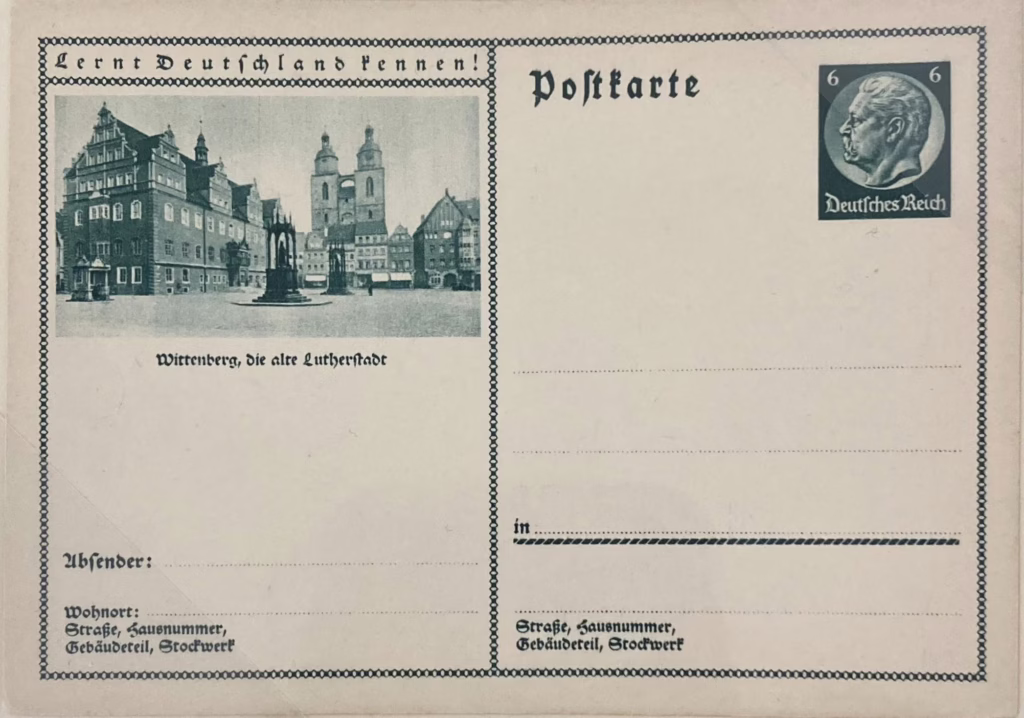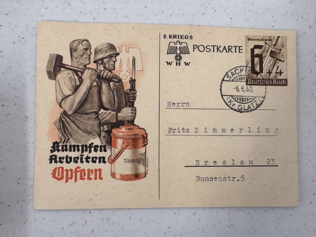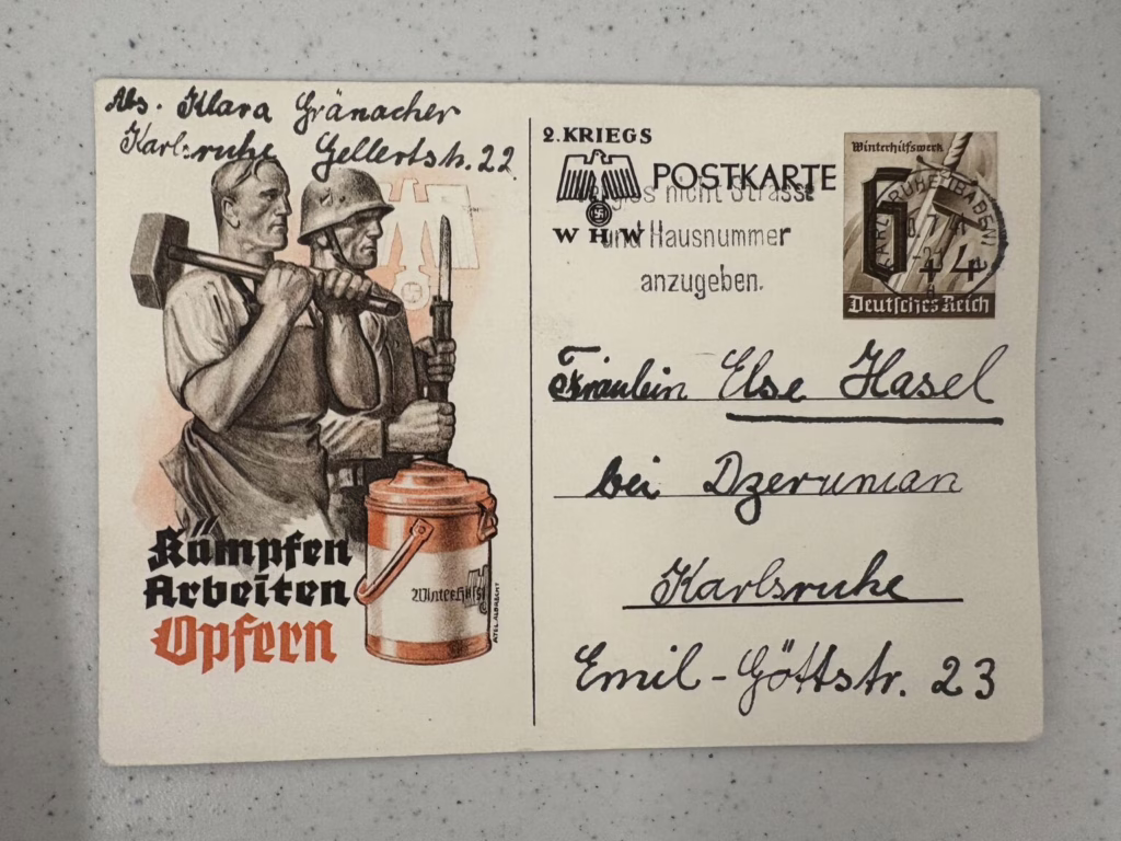Postcards were printed and sold throughout Germany and German-occupied territories. The postcards offered an affordable way to stay in contact with family and friends in an era before wide access to mass communication, and this common form of communication became interwoven with images of Hitler and party symbols. The postcards show the massive popularity that Hitler enjoyed in Germany during this era. Nazi propaganda often used Hitler’s image, building a myth of his supposed invincibility and charisma. The leader became associated with the nation’s prosperity and was portrayed as central to its future success. Hitler’s images cast him as a hero, a father figure, and a protector of Germany—and they appeared almost everywhere in Germany during the years of Nazi rule. By late 1943 the printing of postcards stopped due to extreme material shortages from the war. (Source: USHMM)