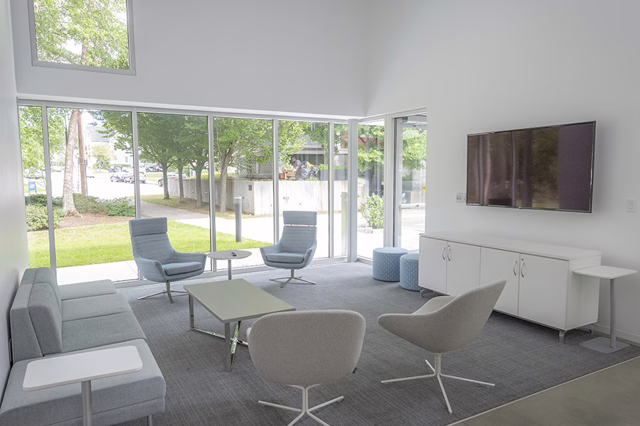 Named The Colin Flug Graduate Study Wing, in recognition of the lead gift contributed by Clark University trustee Dr. Rebecca Colin ’89 and her family, the wing includes a book annex that more than doubles the library’s shelving capacity. Envisioned as a new home for student research, the Tobak graduate student offices (funded in memory of Holocaust survivor Henry Tobak) relocated to the new wing, give students better access to the resources of the library, including books, videos, a study commons, and the Shoah Visual History Archive.
