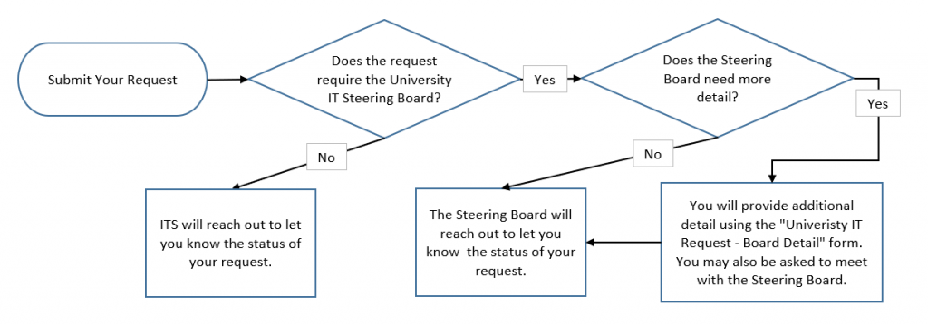 If you would like to submit a request for ITS assistance with a new project or technology resource, please complete the University IT Request Form. Within one month of submitting the University IT Request Form, ITS will be in touch to discuss the details and next steps of your request. Your request will follow the process below: