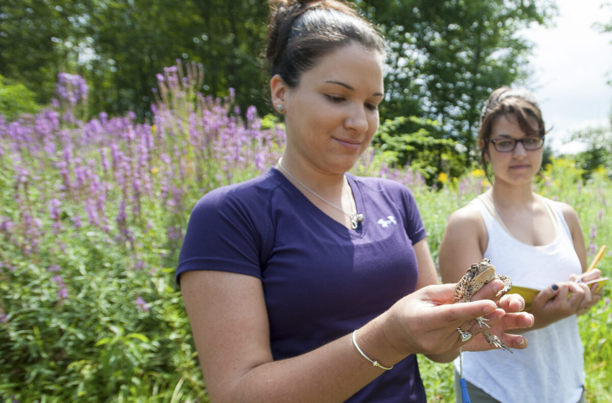 They spent much of the summer in the Westboro (Mass.) Wildlife Management Area and in the lab at the Lasry Center for Bioscience, investigating the dehydration rates of the amphibians to establish connections between the animals’ health and alterations to their habitat. While it may sound counter intuitive that frogs and toads can suffer from dehydration, Harwell and Diebboll note that it does occur when their habitat begins losing water. In fact, amphibians are important early indicators of changes in environmental conditions that could have ramifications for other species.