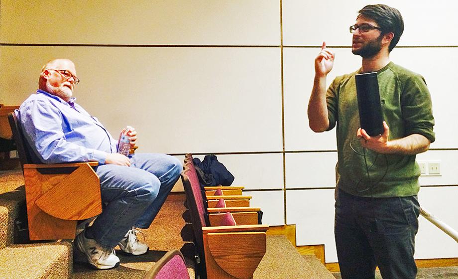 At top: Holding an Amazon Echo device, Jake Kramer speaks to computer science students at Clark University while visiting professor Kenneth Basye watches from the audience.