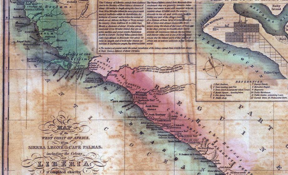 Above, a 19th-century map of the colony of Liberia (courtesy of the Library of Congress)