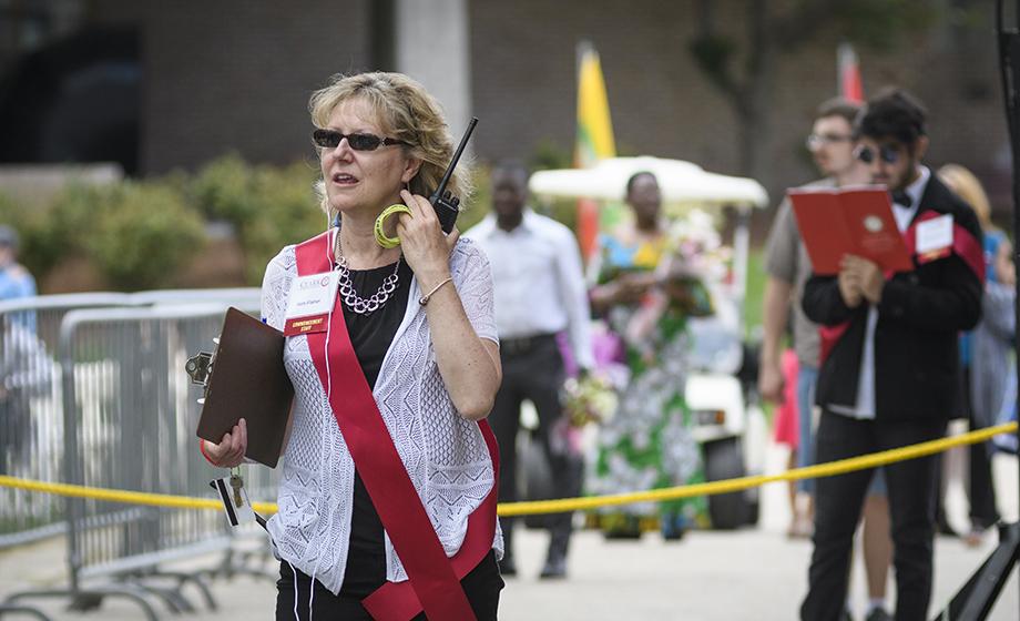 Planning next year’s commencement begins with a postmortem of May’s event. “We celebrate the success of our hard work, but we also see the blips that others don’t notice and start figuring out what we need to adjust the next time,” Fisher says. Negotiating with vendors for such things as tents, regalia and sound production starts in earnest in late summer. By the fall, Fisher will chair meetings of the planning committee — about 30 people representing departments across campus. Her “A team,” a group of eight, meets more regularly and wrestles with the nitty-gritty details, including the best ways to move huge crowds to their destinations. “You can think of it as an extremely complicated theatrical performance,” she says.