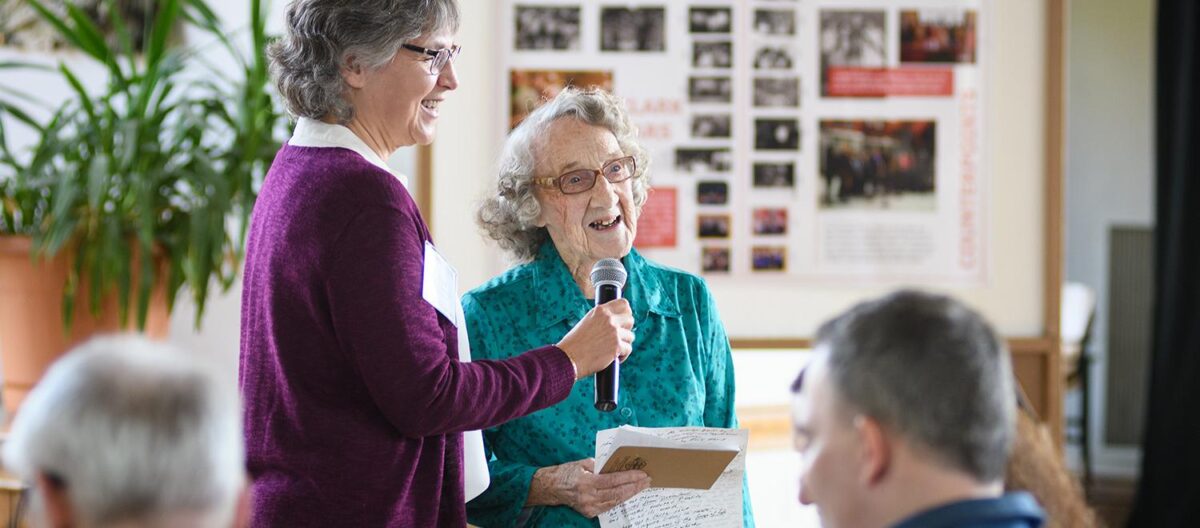 She read her original poem, “The Fundamental Thing as Time Goes By,” and told stories that recalled the “superior education” she received at Clark from legendary professors like Rudolph Nunnemacher in biology and Loring Holmes Dodd in English. She was coxswain on the women’s rowing ream, studied Spanish, French and German, and rode in rumble seats on jaunts through Worcester. Her daily commute from Clinton, Mass., included a walk from the Worcester City Hall bus stop to campus, and back to City Hall for the trip home. The day Franklin Delano Roosevelt died, the buildings along Main Street were draped in black, and the street was eerily silent, she remembered.