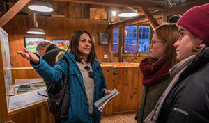 Professor Rinku Roy Chowdhury talks to students Emily Maynard, center, and Bea Bittenbender while touring the River Bend Farm Visitor Center.