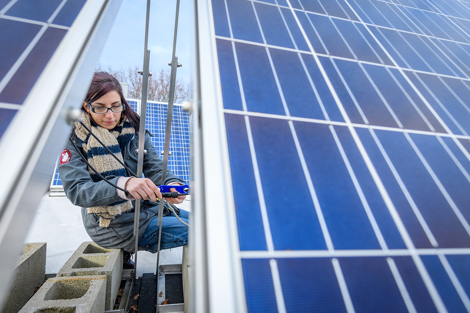 Megan McIntyre ’19 works on a solar panel atop the Biophysics Building at Clark. The solar panels will be used for a cell phone-charging station in the campus’ Bistro; they’re also used for research projects in the Physics Department.