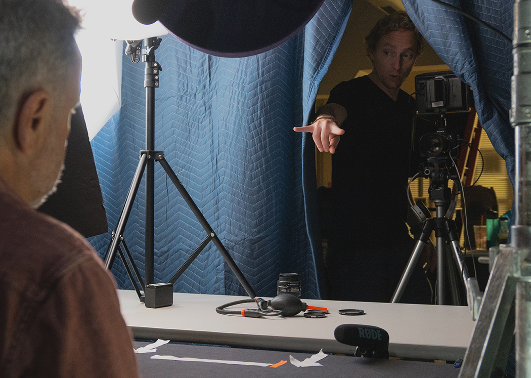 Director of photography Jason Rossi coaches Stephen DiRado on the set of “With Dad.” Photo by Maxwell Sacra ’20.