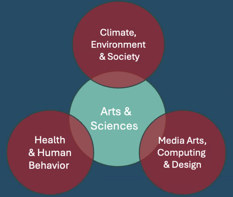 - Refocusing curriculum and academic departments around three key areas of strength that are most relevant to meeting the needs of a changing world — Climate, Environment, and Society; Media Arts, Computing, and Design; and Health and Human Behavior — while also sustaining the University’s liberal arts foundation to further drive outcomes and better meet student needs/preferences.
