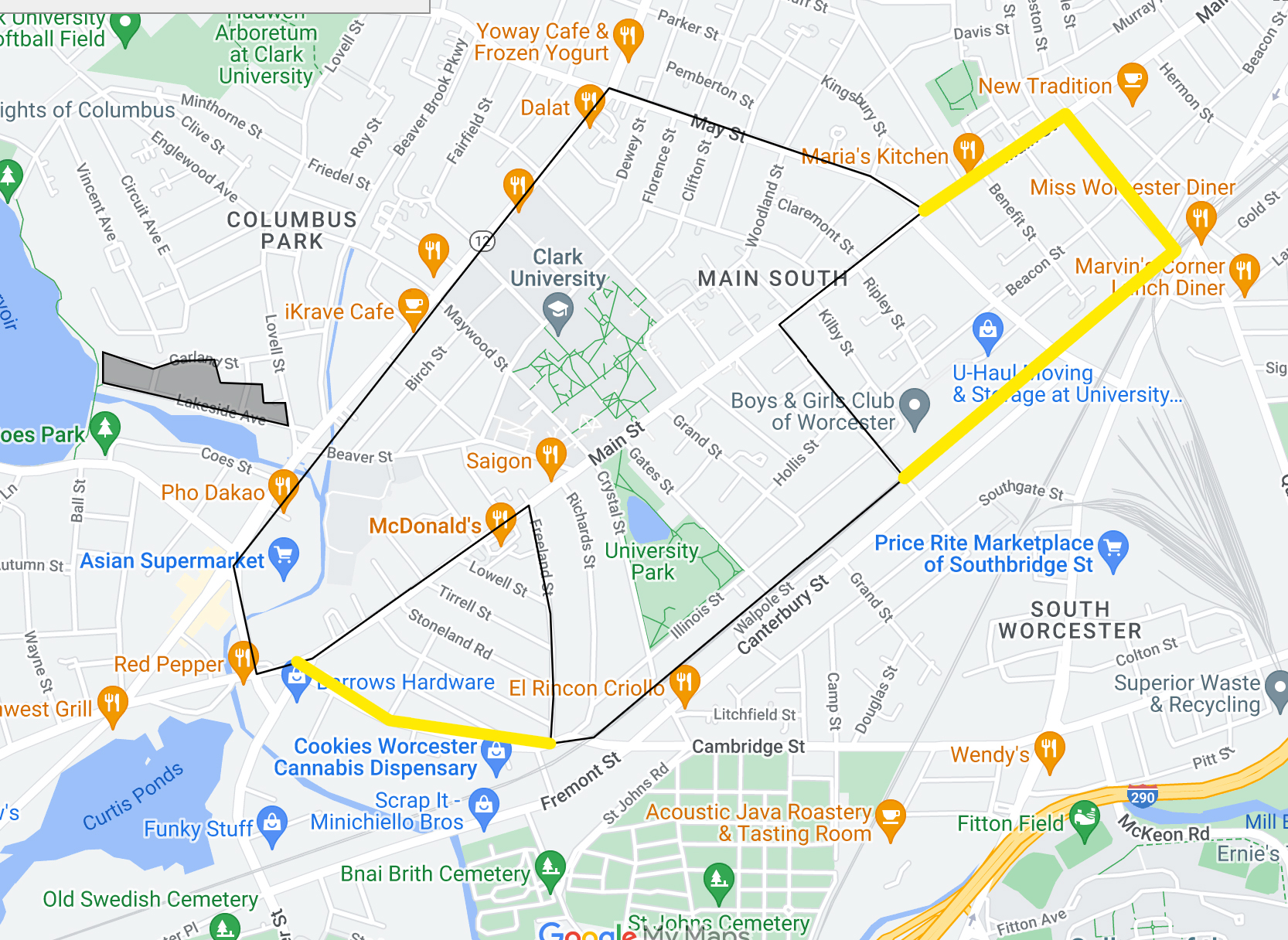 The neighborhood is roughly bounded by Park Avenue, and May, Main, Lagrange, and Cambridge streets and the Conrail tracks.